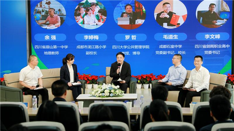 教育家精神,四川教育人如何在实践创新中领会、践行?在“论发展”单元,四川大学教授罗哲、成都市龙江路小学副校长李婷梅、成都市石室中学校长毛道生、广元市剑阁职业高级中学校书记李文峰和四川省眉山第一中学教师余强就何为“川派教育名家”的特质、如何践行“教育家精神”等展开圆桌论坛。大家深入交流和讨论对教育家精神的深刻领会与时代表达,展现了川派名师名校长追求卓越、勇于创新的精神风貌。