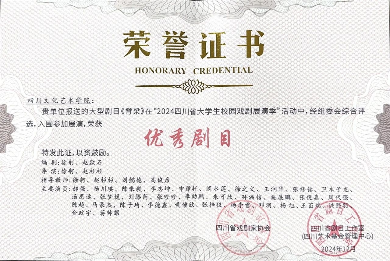四川教育发布 2025-01-094061近日, 四川文化艺术学院戏剧影视学院结合学校学科专业特点和教学实践工作实际,探索“课程思政+艺术实践”跨专业融合教学新模式,创排的歌颂“两弹一星”精神的大型原创话剧《脊梁》荣获四川省文化和旅游厅、四川省教育厅、四川省戏剧家协会、四川省剧目工作室(四川艺术基金管理中心)联合颁发的“优秀剧目”称号,并入选四川省第三届大中小学铸牢中华民族共同体意识校园舞台剧展演。