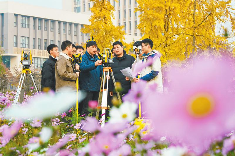 西南石油大学土木工程与测绘学院学生在校园里开展工程测量实践。