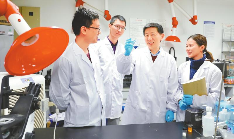 四川大学生物材料工程研究中心主任王云兵教授(中)为学生讲授实验要点。