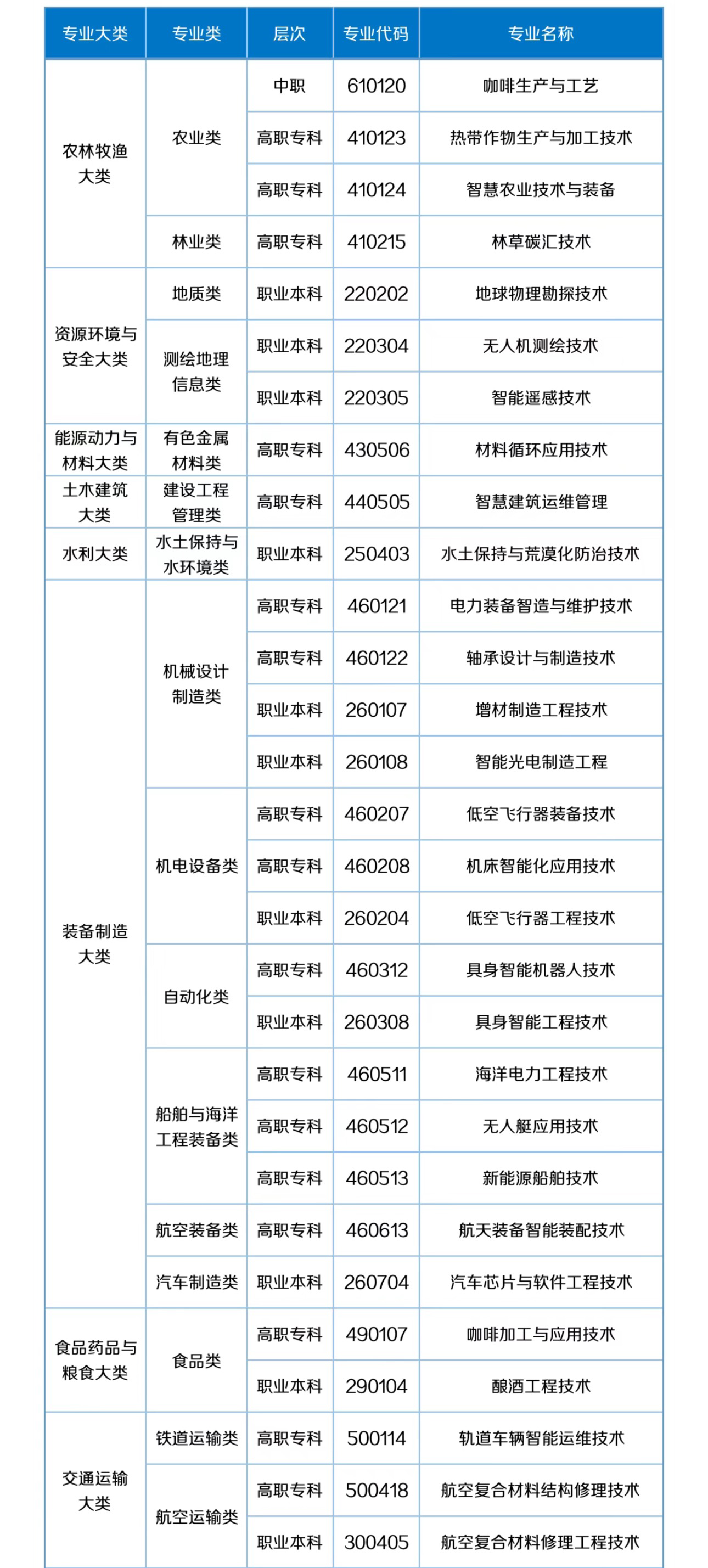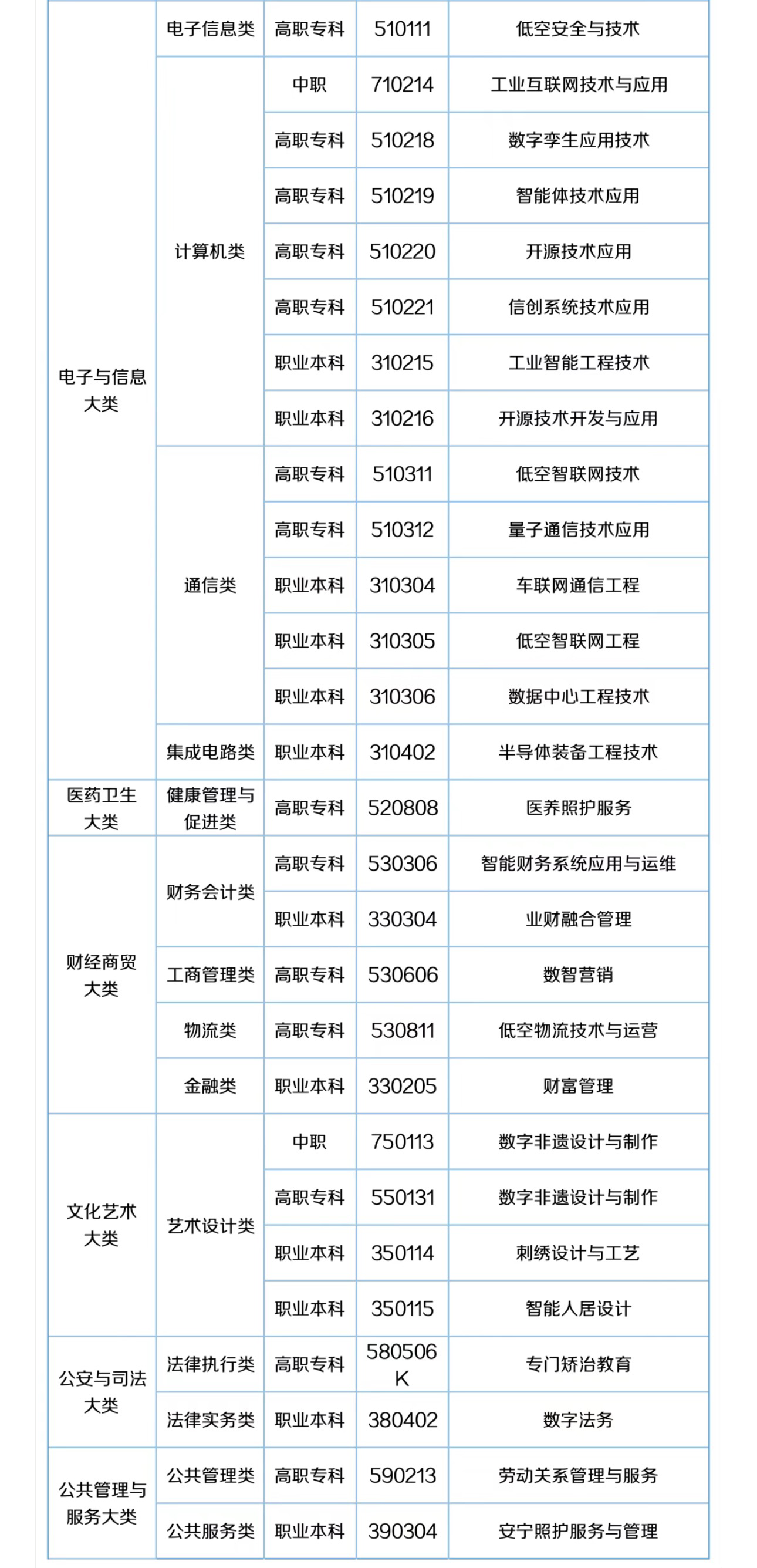 依据《国家职业教育改革实施方案》要求,原则上每5年修订1次职业院校专业目录,学校依据目录灵活自主设置专业,每年调整1次专业。2025年7月,教育部职成司发布《关于组织开展2025年职业教育专业目录增补专业论证工作的通知》,旨在围绕国家战略和区域、行业高质量发展新需求,促进专业设置与区域产业布局紧密对接,重点论证增补低空经济、人工智能、数字经济等新兴领域,新能源汽车、航空航天装备、集成电路等先进制造业,生物育种、农产品种养和加工、农业经营等现代农业,养老、托育等现代服务业重点领域相关专业。