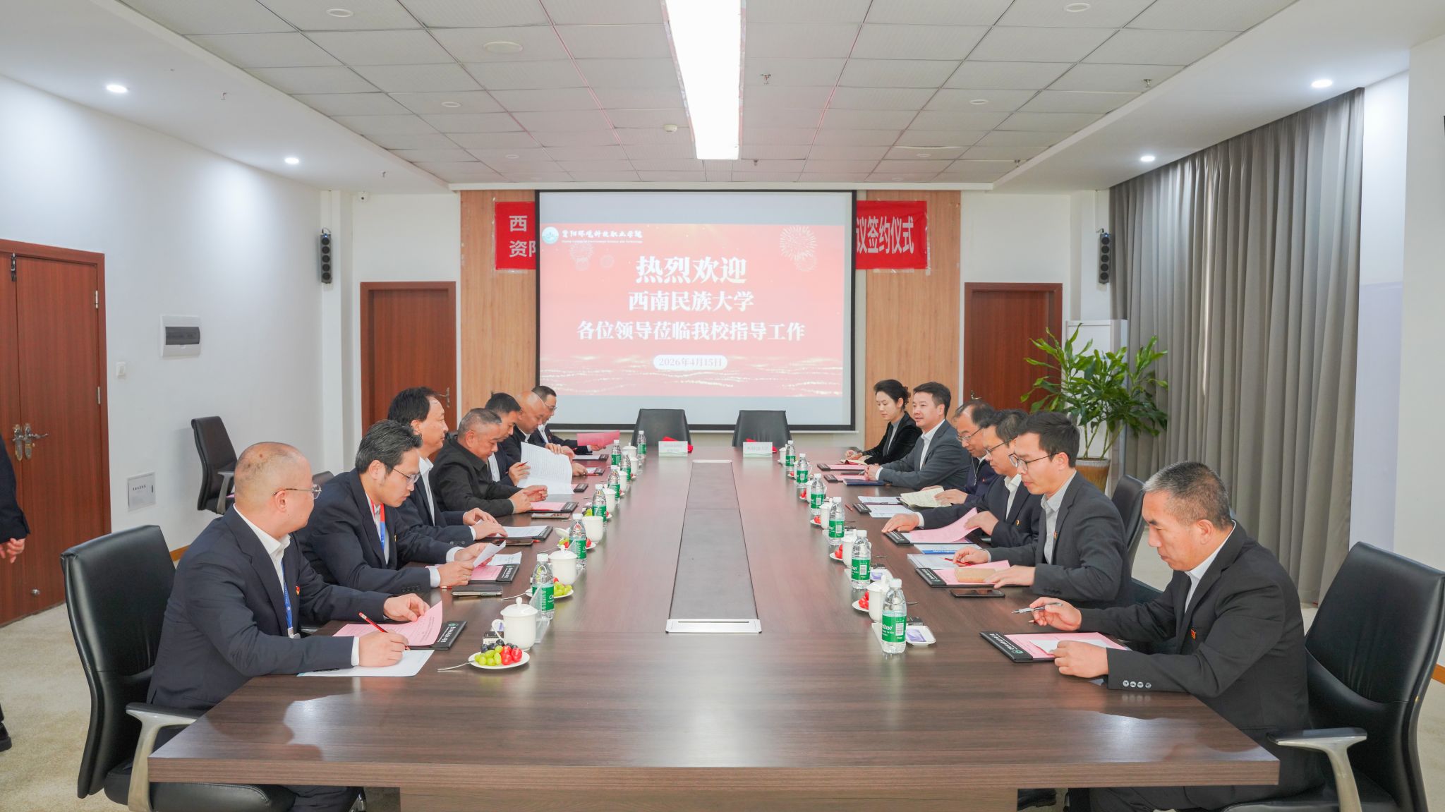 签约仪式上,西南民族大学和资阳环境科技职业学院两校代表共同签署《西南民族大学资阳环境科技职业学院党建和思想政治工作结对共建规划协议书(2026—2030年)》。