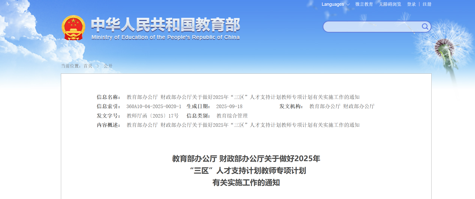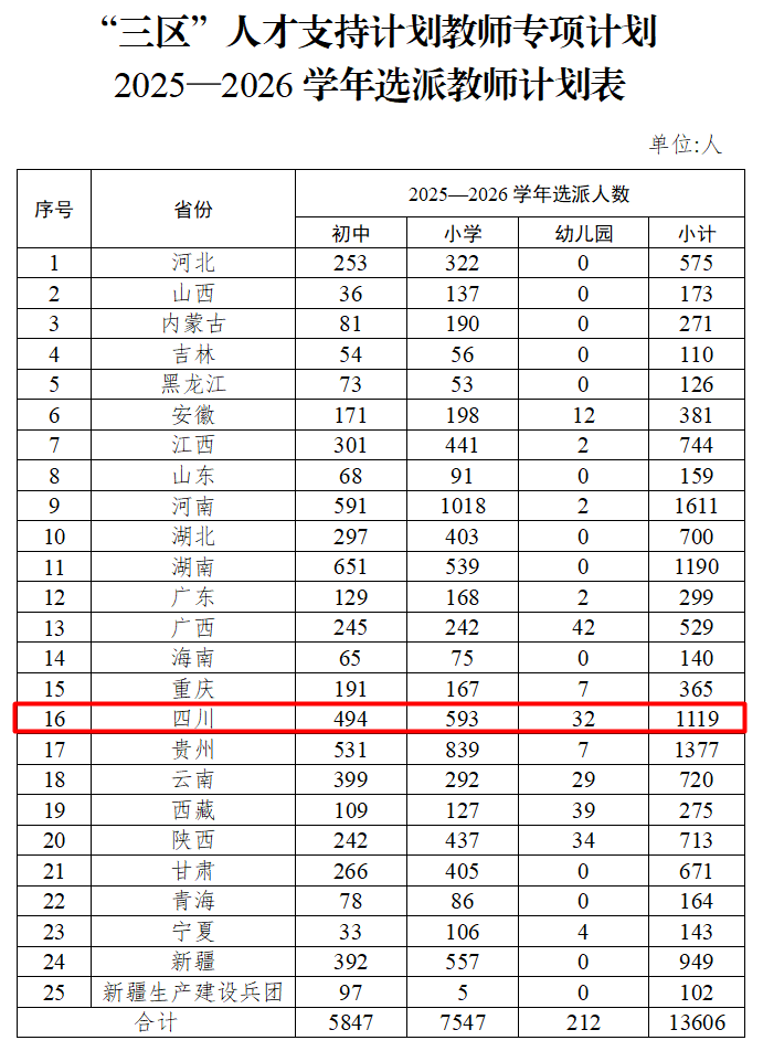 近日,教育部、财政部联合印发《关于做好2025年“三区”人才支持计划教师专项计划有关实施工作的通知》(以下简称《通知》),部署实施2025年“三区”人才支持计划教师专项计划计划选派13606名教师赴“三区”,其中四川1119人。一起来了解——