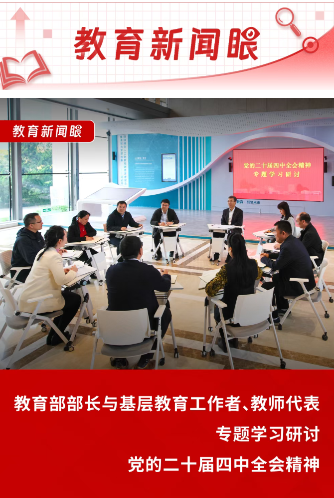 10月30日下午,国家教育行政学院,10名正在学院参训的教师和基层教育工作者组成学习小组,对党的二十届四中全会精神进行专题学习研讨。学习贯彻党的二十届四中全会精神中央宣讲团成员,教育部党组书记、部长怀进鹏参与了这场学习研讨。