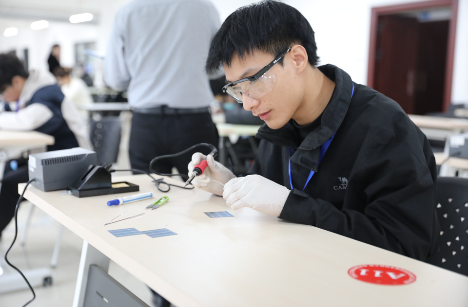虚拟仿真操作区,选手们手指在键盘和鼠标上快速舞动,目光紧盯屏幕上的光伏组件模拟生产界面,精准完成每一个操作指令;焊接实操中,选手们手持精密焊枪,在薄如蝉翼的光伏电池片上精准操作,展现出一场“毫厘之间见真章”的较量。