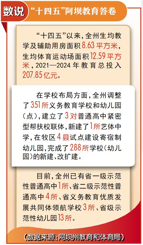 俄沙娜姆的“小感悟”折射出阿坝州在教育发展上的“大投入”。自“十四五”规划实施以来,阿坝州积极贯彻教育优先发展战略,统筹中央、省、州三级专项资金近40亿元,重点用于基础设施建设、教育经费投入及教师优待政策的落实,有力提升各学校办学条件。除了抓“硬件”提升,该州还通过加强教师队伍建设、深化区域交流合作,抓“软件”提质,以点带面提升全州教育整体质量。