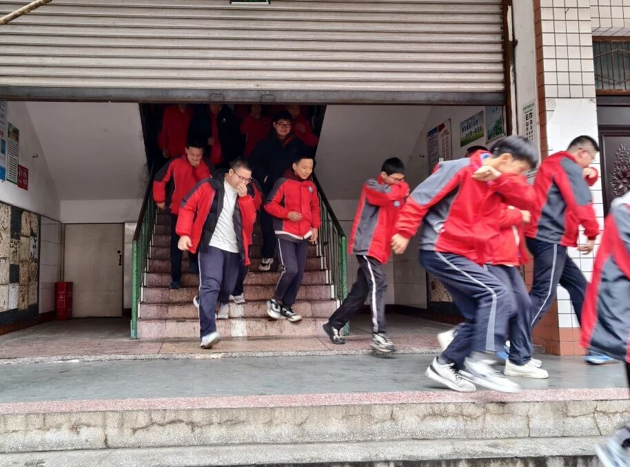 随着演练指令下达,模拟火情信号响起,各班级学生在班主任和任课教师的引导下,迅速反应,严格按照“弯腰低姿、捂鼻前行、靠右快速通行”的要求撤离教室。前四排学生走前门,后排学生走后门,整个过程紧张有序。各教学楼按照“低层先撤、高层依次跟进”的原则组织疏散,年级之间分区域、分楼梯有序撤离。楼道值守教师全程指挥,提醒学生保持安全距离,防止拥挤和滞留。全校师生在短时间内高效完成疏散,安全集结至操场指定区域,各班级迅速清点人数并向年级负责人汇报,演练过程井然有序。