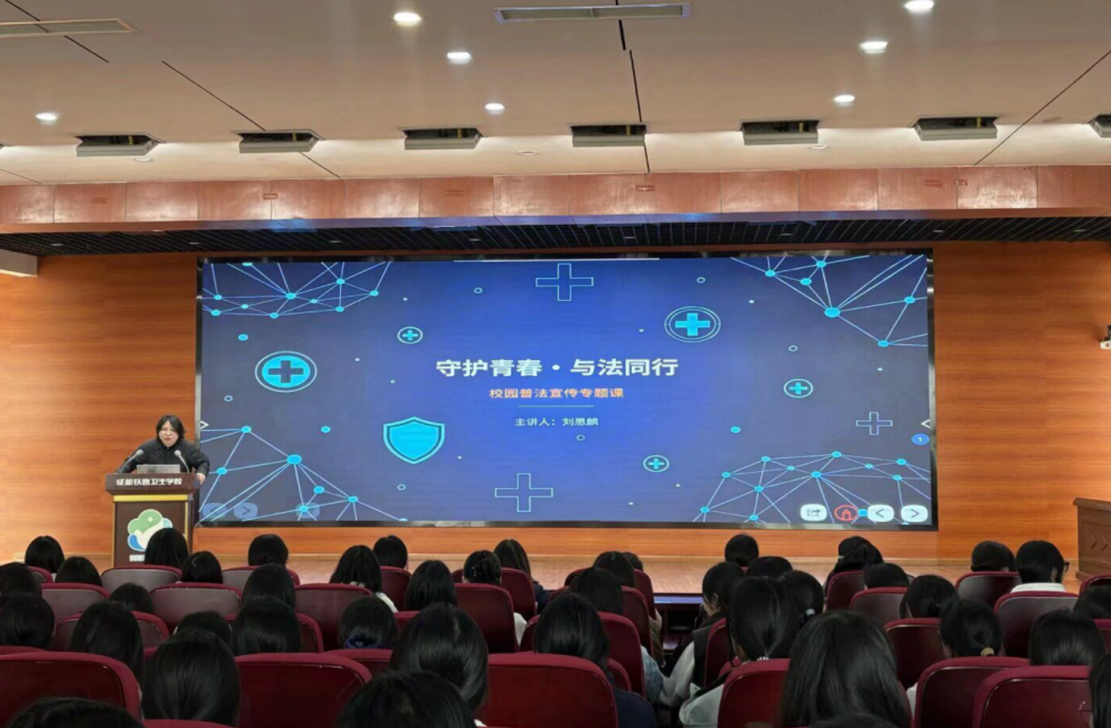 近日,为进一步加强校园法治建设,增强青年学生法治观念与自我保护意识,筑牢青春成长安全防线,成都铁路卫生学校“仁爱大讲堂”法治教育专题讲座在学校科技楼6楼圆满举行。本次讲座特邀四川省女子监狱的刘思麟主讲。师生齐聚现场,共上一堂生动的法治成长必修课。