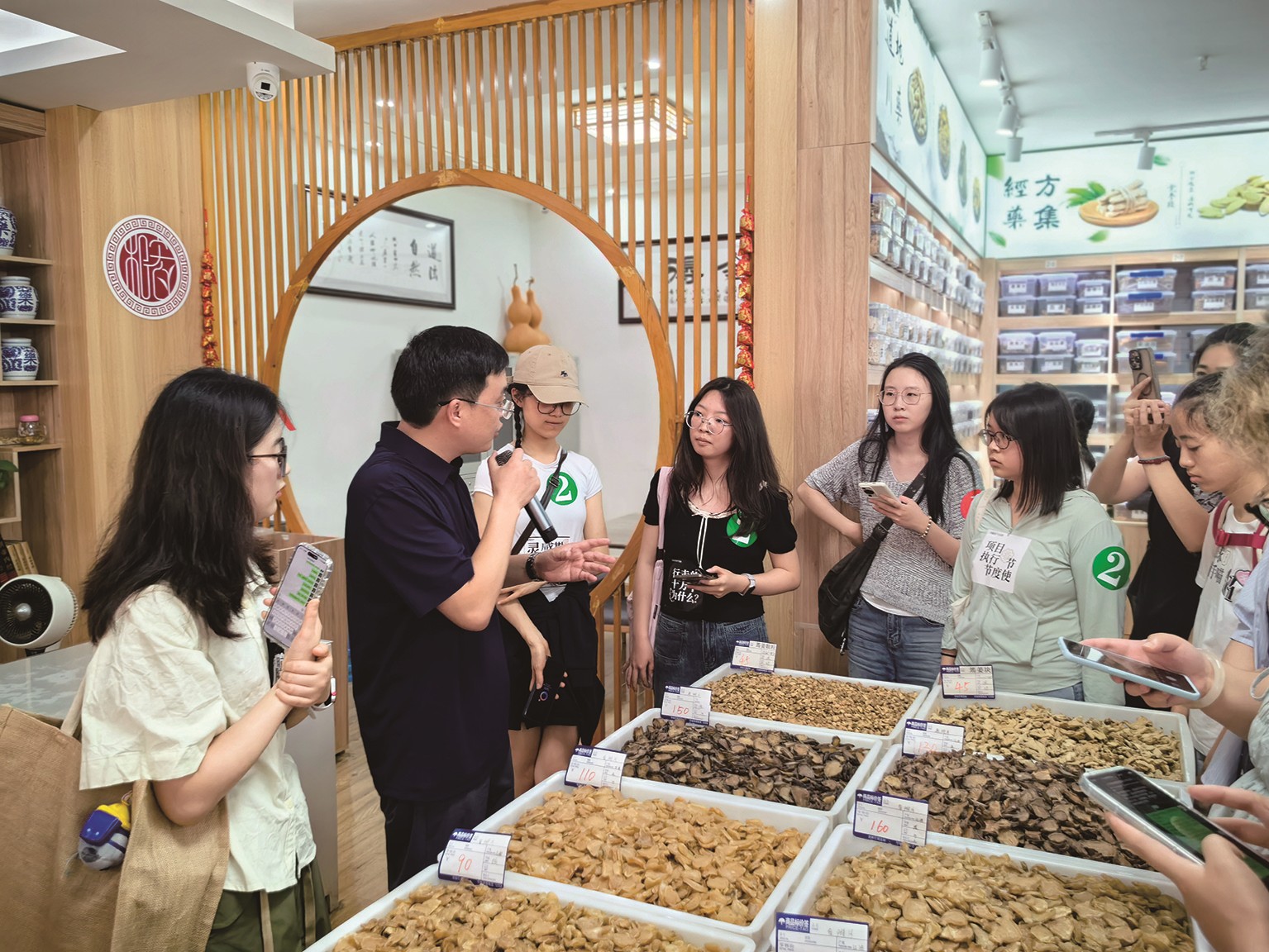 “中药材有地域性,业内称之为‘到地药材’。了解中药材的地域性,对不同地区的市场开发相当重要。”在企业的实体店铺里,创始人郭利辉从中药材特性讲到市场开发,给学生们详细介绍了地理位置、商品特性、竞争环境等对引流获客带来的影响。他告诉学生们,由于市场竞争激烈、产品同质化严重,企业目前正准备将业务从批发拓展到零售。他还带领学生们参观了刚刚装修完成的两个零售店铺。