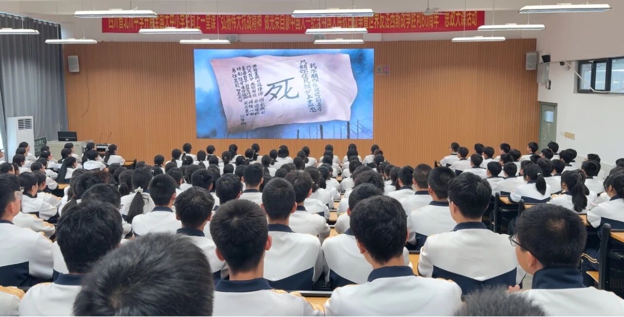 “一面‘死’字旗上,‘我不愿你在我近前尽孝,只愿你在民族分上尽忠’的父训,是父子间 ‘尽孝化作尽忠’的家国抉择,也凝结着川军 ‘宁为玉碎,不为瓦全’的誓言,更是中华民族 ‘向死而生’的精神图腾。”北川中学思政课教师田颂在和同学们一起看完思政大课后,心情久久难以平静。她向同学们抛出问题:“身处和平时代的青少年学生,该如何延续抗战精神呢?”
