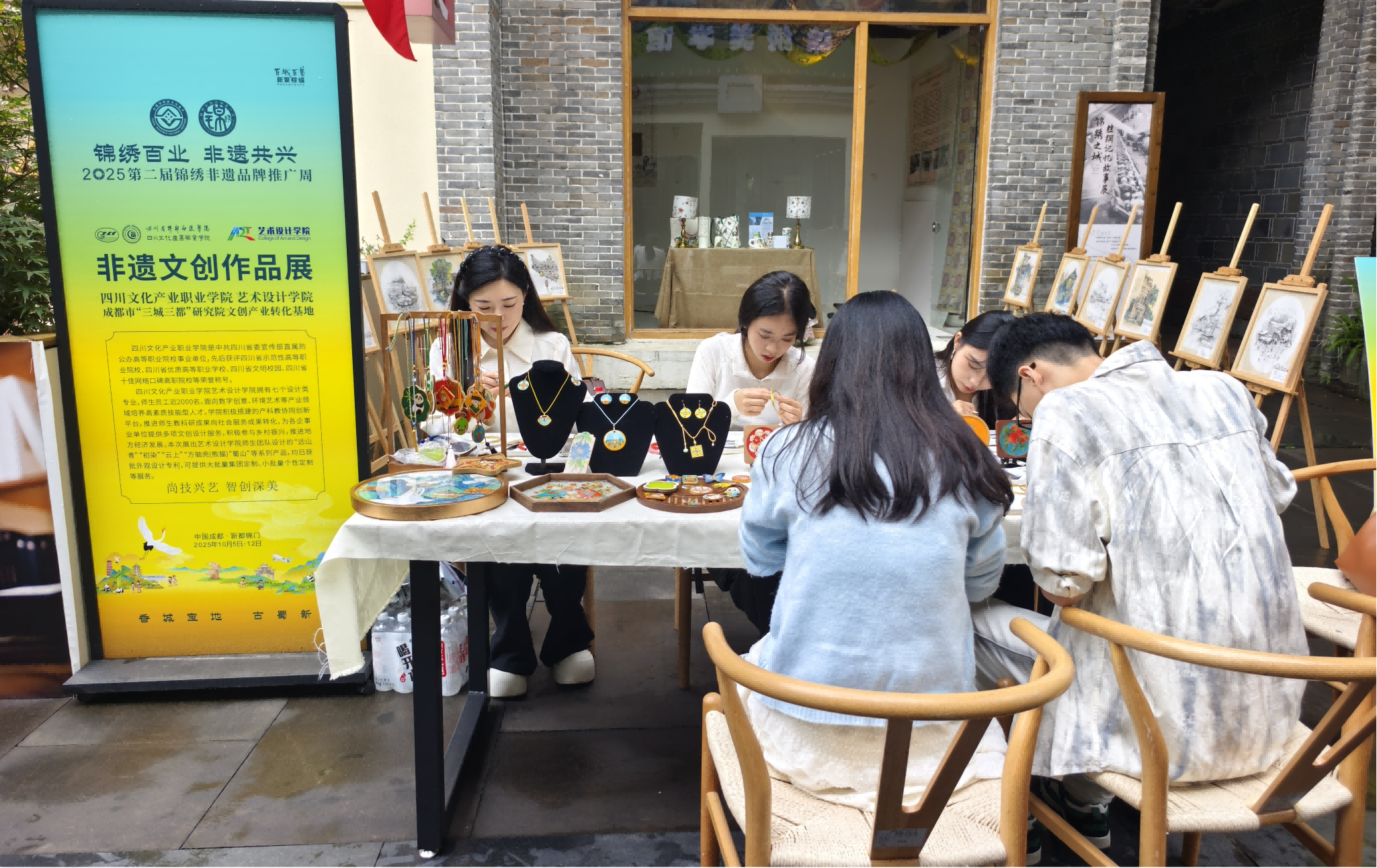 四川文化产业职业学院艺术设计学院作为成都市“三城三都”研究院文创产业转化基地,依托文创设计专业优势及产教融合实践基础,一批优秀的文创产品和学生写生作品在大会期间亮相。作为青年一代对传统美学的理解与表达,展品集中呈现了师生将非遗元素与现代设计理念结合的创新成果。其中,数字媒体艺术设计专业校企合作工作室师生团队现场开设掐丝珐琅手工体验项目,让参会嘉宾与游客亲身感受掐丝珐琅的细腻工艺,在互动中拉近大众与非遗的距离,赢得现场广泛好评。