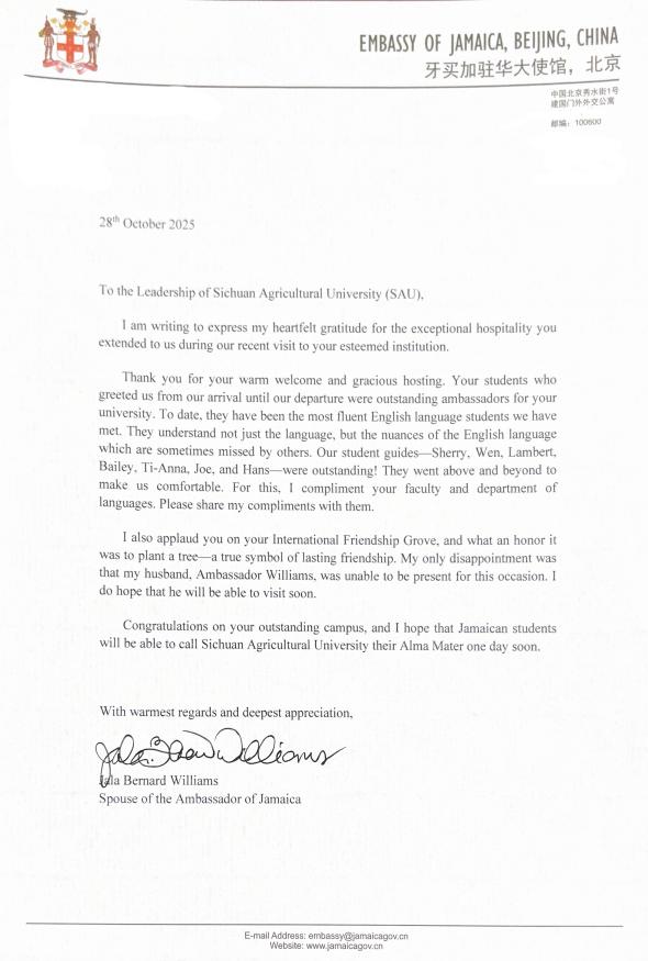 近日,牙买加驻华大使夫人拉拉・伯纳德・威廉姆斯向四川农业大学发来亲笔感谢信,高度赞誉该校学生的卓越跨文化素养及“国际友谊林”的深远意义。