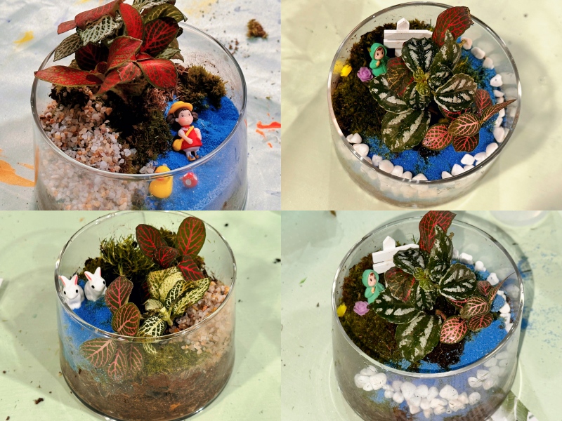 在“零碳微森林制作”环节,队员们引导孩子们用松果搭建“树木”、石子铺成“小路”、苔藓装点“草坪”,并融入小鸟、昆虫等元素构建微型生态场景。大家不时分享材料、交流想法,在协作中共同完成作品。最终,一件件微景观汇集成一座“小小零碳公园”,“松鼠的家”“绿色小天地”等童趣名称展现了对自然的纯真向往。