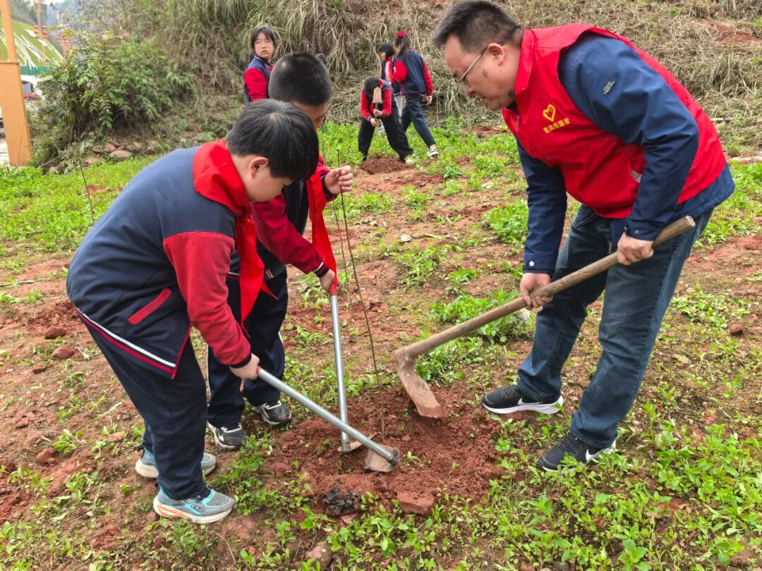 活动现场,党员干部率先示范,师生们分工协作、默契配合,挥锹挖坑、扶苗填土、浇水定根,用实际行动为乡村添绿增彩。同学们在亲近自然、动手实践中,强健体魄,增强社会责任感,实现身心健康协同发展。