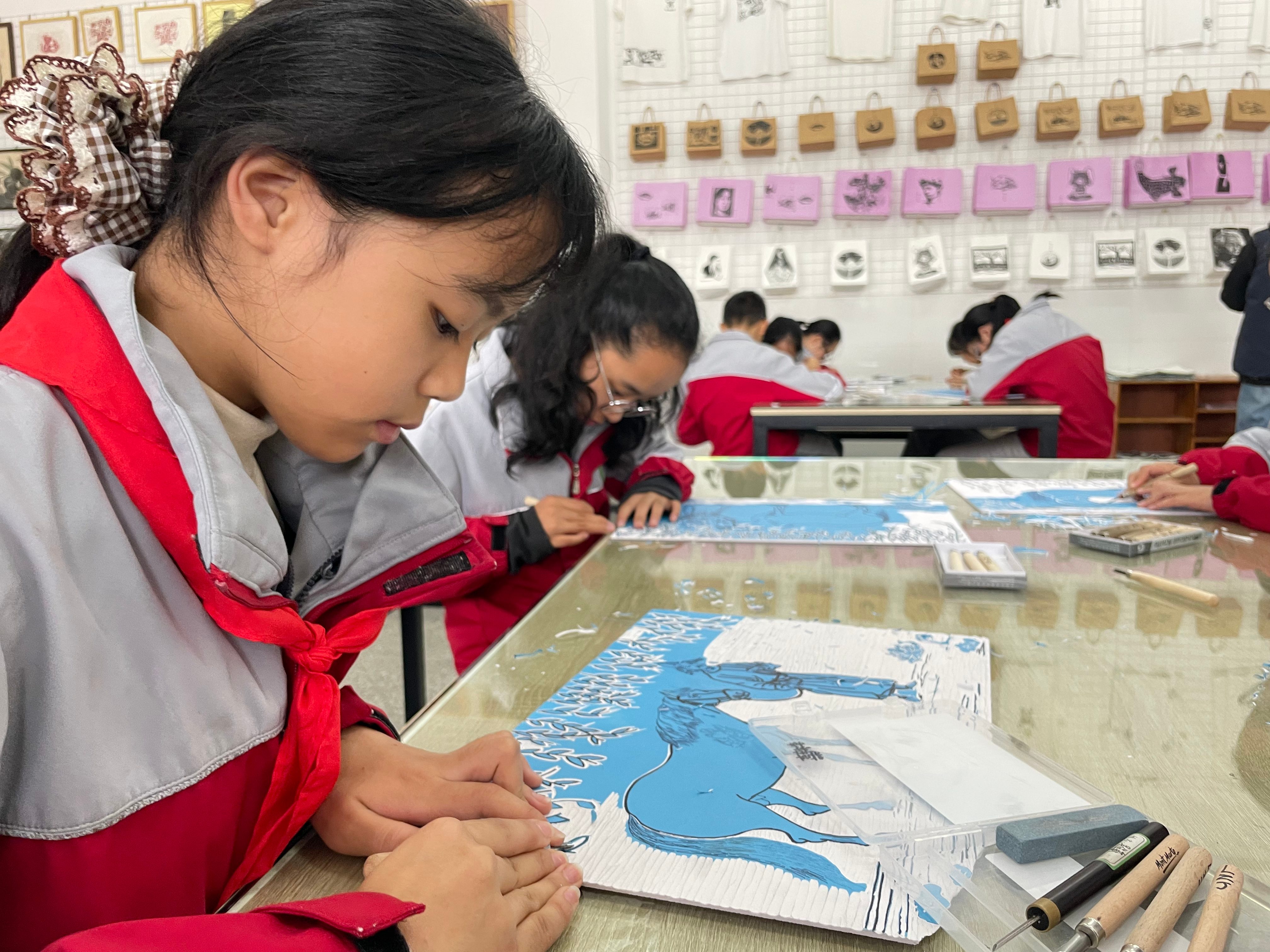 除了艺术创作,该校还将版画延伸至生活应用。学生作品被拓印在手提袋上,制成兼具实用性与艺术感的文创产品;装饰木刻则装裱展示,使教学楼成为“流动的版画展厅”。在近期的一节版画课上,学校六年级一班的同学们合作完成了以“马”为主题的作品。有同学发表感悟:“过去我认为艺术就是要画得像,现在明白了用刻刀表达自己的想法,也能创作出独特的作品。”