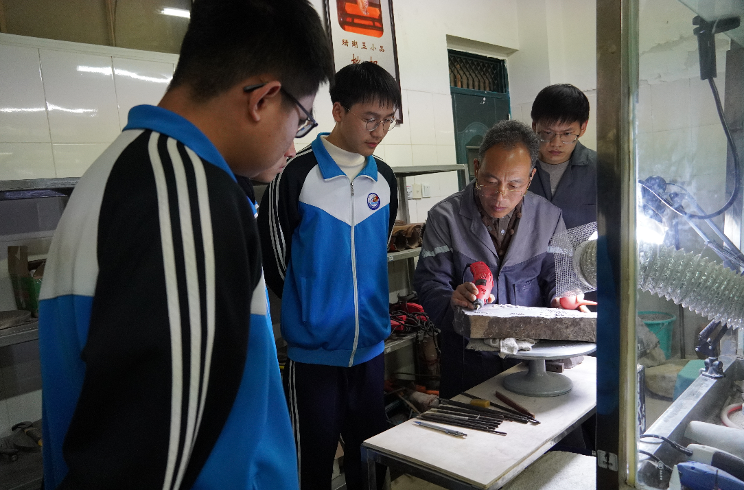 “大家看这块白花石的纹理,下刀要顺着肌理走,力道轻了没质感,重了就毁了整体造型。”近期,广元市职业高级中学校的白花石刻工作坊内,四川省工艺美术大师、白花石刻非遗传承人谢志才正手持刻刀,向学生们传授技法。指尖起落间,石料原本杂乱的白色纹理“开”出一朵朵米兰。这样的场景,在该校已延续了十年。