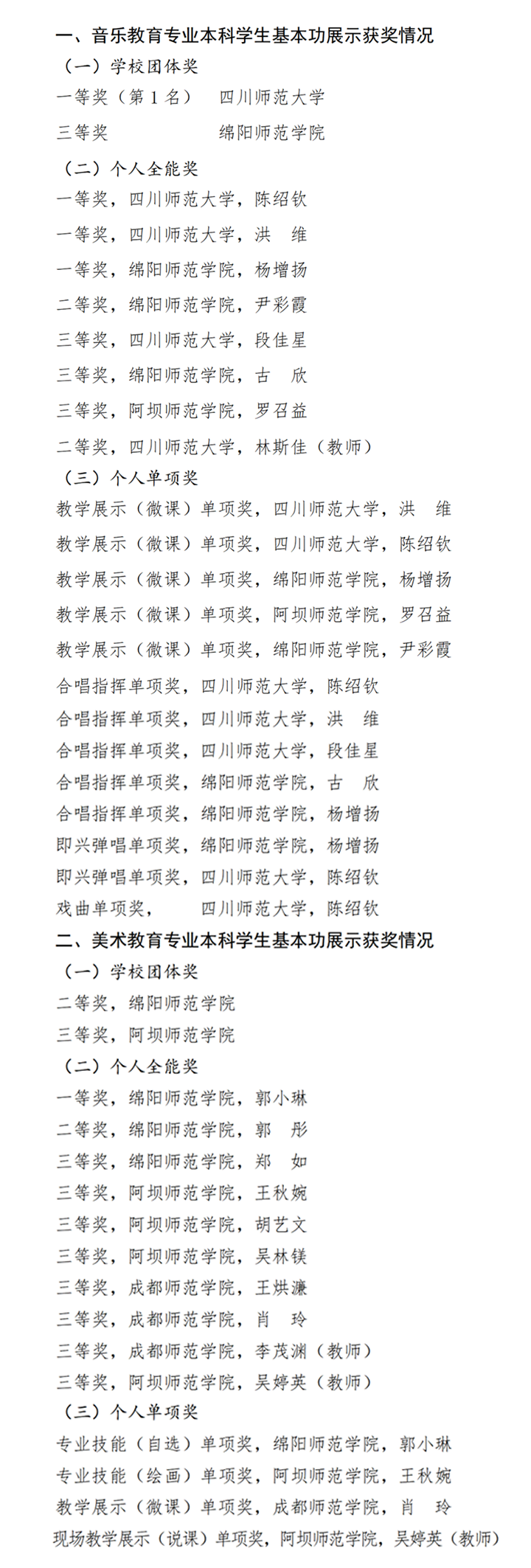 音乐教育基本功展示获团体奖2个,学生和教师队伍共获个人全能奖8个,个人单项奖13个,占总获奖数的9.5%,获奖数占比与浙江、江苏、上海并列全国第一。其中,四川师范大学获团体一等奖第一名,美术教育基本功展示获得团体奖2个,学生和教师队伍获个人全能奖10个,个人单项奖4个,占总获奖数的5.4%,获奖数占比居全国第五,四川省教育厅获“优秀组织奖”。一起来看获奖名单。