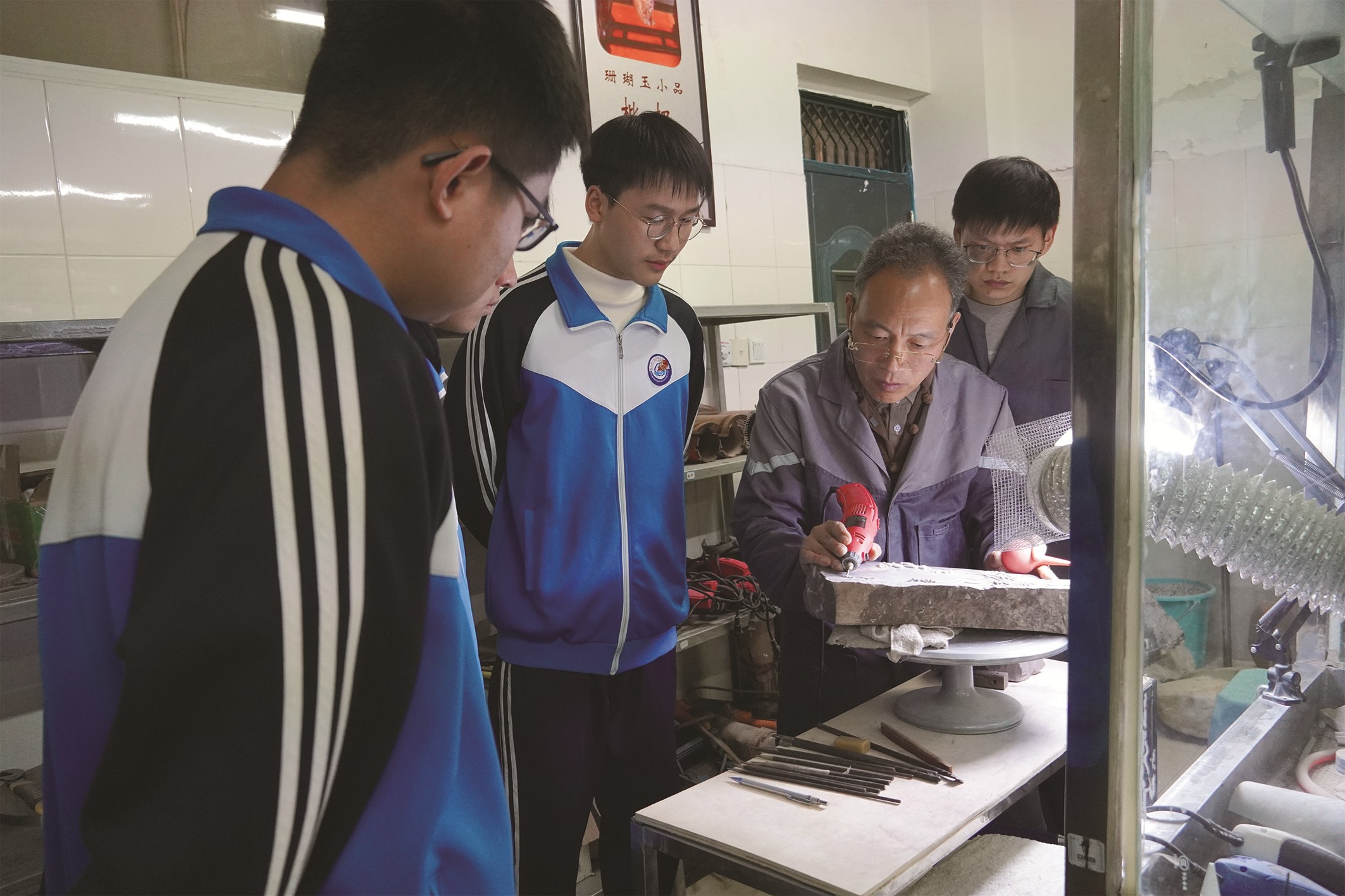 白花石是广元当地独有的石材,白花石刻则在遵从石料天然纹理的基础上,赋以人文审美和技法雕琢,是古蜀道上一代代匠人用智慧与汗水凝结的国家级非物质文化遗产。2015年,广元市职业高级中学校深入挖掘白花石刻的技术和文化价值,开设白花石刻学生社团,每周邀请谢志才到校传授技艺、传承匠心。学校党委书记祖晓燕说:“这既能传承非遗技艺,又能锻炼职教学生的动手能力,让学生在一凿一刻间体会精益求精的工匠精神。”