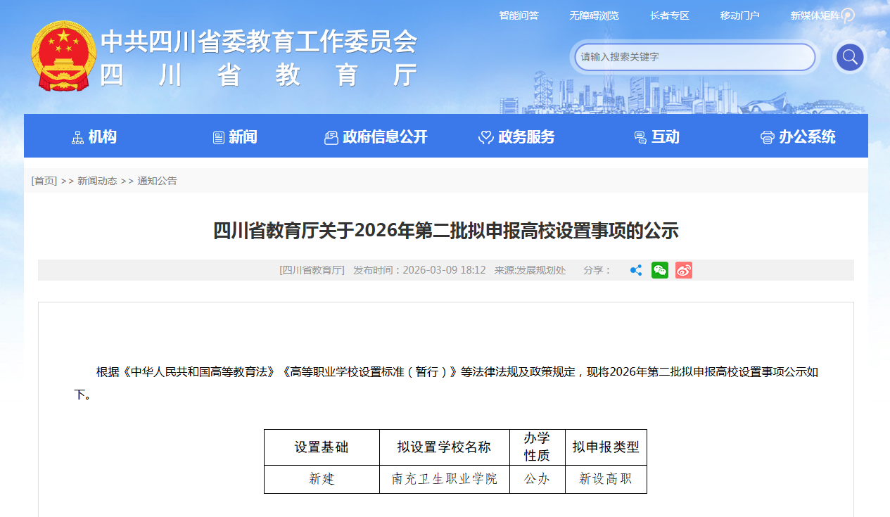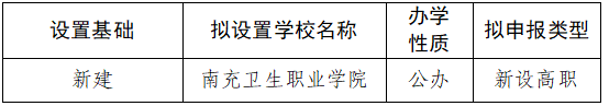 据教育厅网站消息,四川拟新建南充卫生职业学院,目前正在公示。
