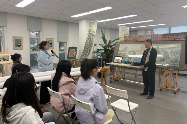 本次活动源于四川财经职业学院“非遗华章,美育领航”主题研学实践。在学校美育教师组织下,财税等专业学生走进传习所,与国家级非遗传承人、工艺大师面对面交流。活动中,国家级非遗蜀锦传承人、AI新锦绣开创者钟明现场示范铺针、滚针等经典针法,并通过PPT与视频,系统介绍AI技术在非遗创新中的应用;工艺大师刘道华讲解蜀绣纹样寓意与创作思路,学生们亲手执针走线,沉浸式感受蜀绣蜀锦的千年匠心。