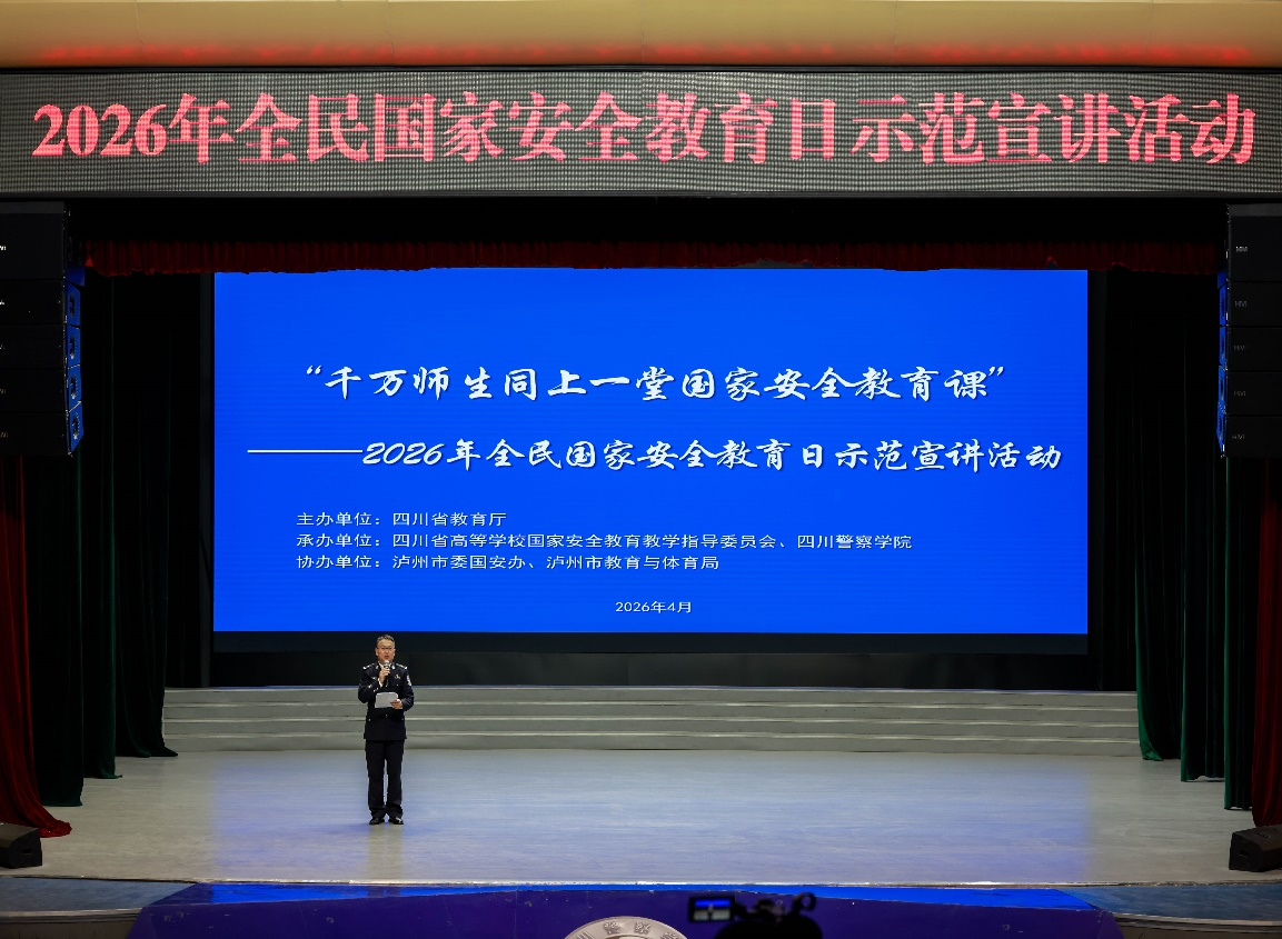由四川省教指委主办,四川警察学院、四川大学分别承办的“千万师生同上一堂国家安全教育课”2026年全民国家安全教育日示范宣讲活动近日相继举行。4月2日,首场宣讲活动在四川警察学院举行,四川省教育厅、泸州市委办公室、泸州市委教育工委有关负责同志,泸州市相关单位代表及驻泸7所高校师生代表共200余人参加活动。宣讲环节中,全国学校国家安全教育指导委员会委员、四川教指委主任委员、四川警察学院党委副书记、院长唐雪莲,“全国公安系统二级英雄模范”和“全国优秀人民警察”获得者、广安市武胜县公安局禁毒大队政治教导员熊中华,泸州市公安局网络安全保卫支队情报信息大队副大队长杨帆,四川警察学院“风险哨兵”宣讲团,分别代表高校领导、英模人物、基层干部、师生党员4类群体,围绕社会安全、政治安全、网络安全、反间防谍4个领域,以“筑牢政治安全防线,彰显青年时代担当”、“筑牢社会安全防线,坚决打赢禁毒人民战争”、“保护网络空间,守卫无形疆域”、“反间无形,你我共守”为题作了主题宣讲。