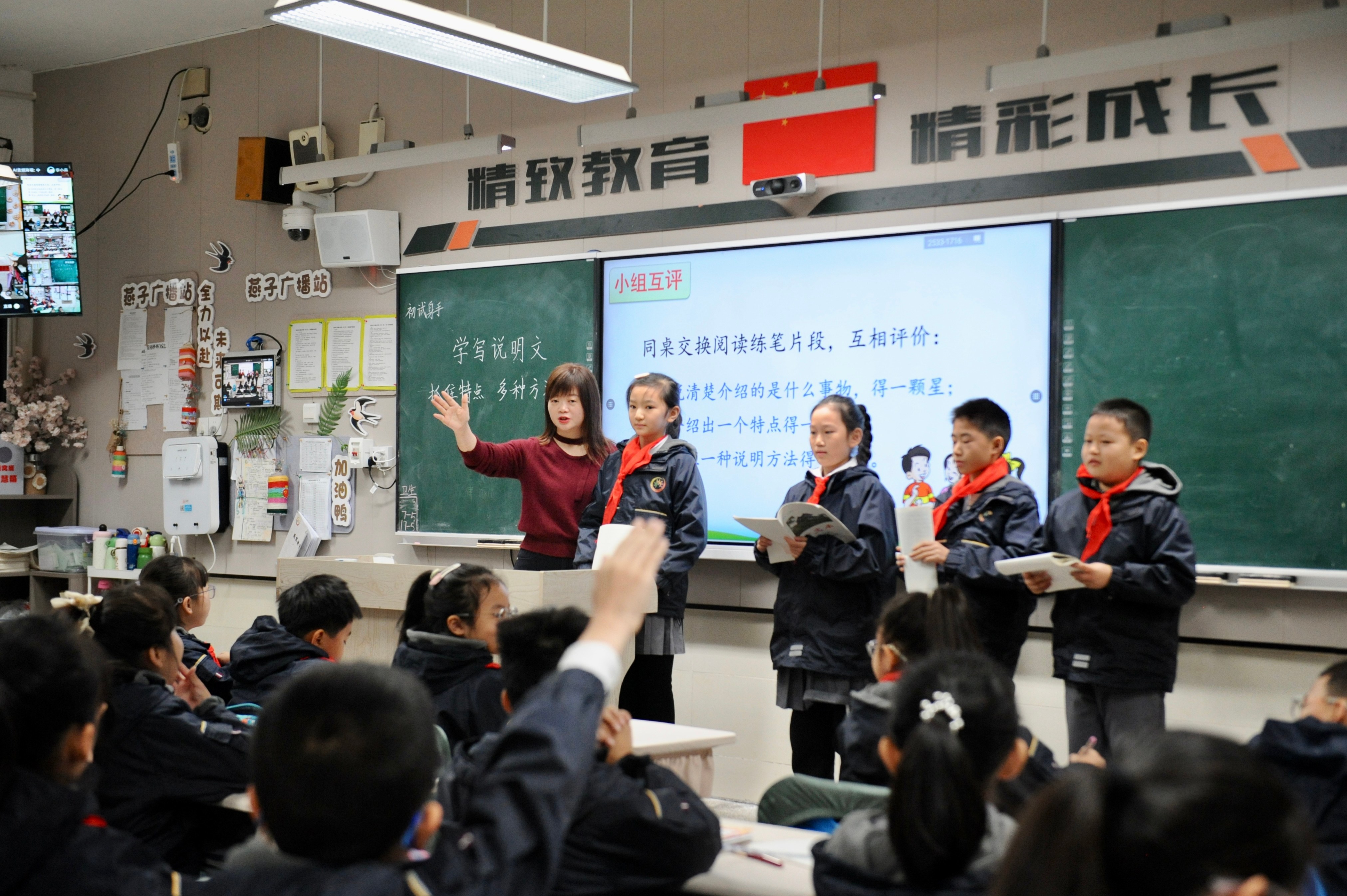 在录播课堂的推行过程中,宜宾市人民路小学以学生为中心,不断创新教学模式,让课堂更具吸引力与实效性。李小燕在说明文单元教学中,打造“种子课”示范教学,通过“观察、分析、实践、评价”四步教学法,引导学生掌握列数字、作比较、打比方等说明方法。课堂上,她先展示电视塔的图片,让学生直观感受其特点;再通过范例解析,讲解说明方法的运用技巧;随后给学生5分钟时间进行片段写作,鼓励学生选择感兴趣的事物进行介绍;最后组织同桌互评、全班展示,当场反馈学习效果。