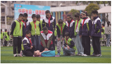 3月30日是第31个全国中小学生安全教育日。近日,眉山市彭山区鹏利小学开展“守护生命健康同行”生命安全与健康教育主题活动,专业应急救援人员向学生传授心肺复苏、包扎等应急救护常识技能,普及急救知识,提高学生的安全防范和自我保护意识。图为专业应急救援人员向学生讲解应急救护知识。