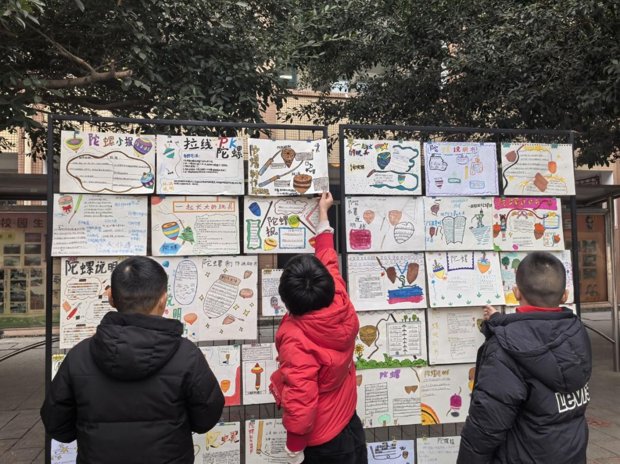 以亲子制作筑牢成长合力。鼓励学生与家长携手完成陀螺制作,并参照课文玩法练习抽陀螺。活动得到家长们的积极响应,亲子间或挑选天然木纹木材匠心打造,或翻出珍藏的老陀螺重温经典,或反复打磨缠绳、拉绳、抽打等动作,在协作互动中增进亲情,让家庭成为实践育人的重要阵地。随后,学校开展“陀螺创意设计”实物评比活动,由大队部学生代表组成评审团,评选出“陀螺设计大师”“陀螺设计高手”“陀螺设计新秀”等荣誉称号,既激发了学生的创作热情,又培养了其审美能力与竞争意识。